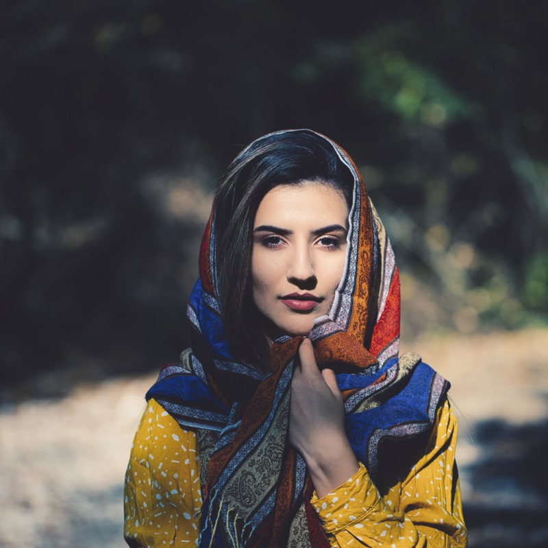 将头发全部盘起,最好不要扎成丸子头,用发卡将头发固定,利用丝巾绕着整个头型包住。脑后的头发蓬松立体,愈发衬托出动人的精致五官。