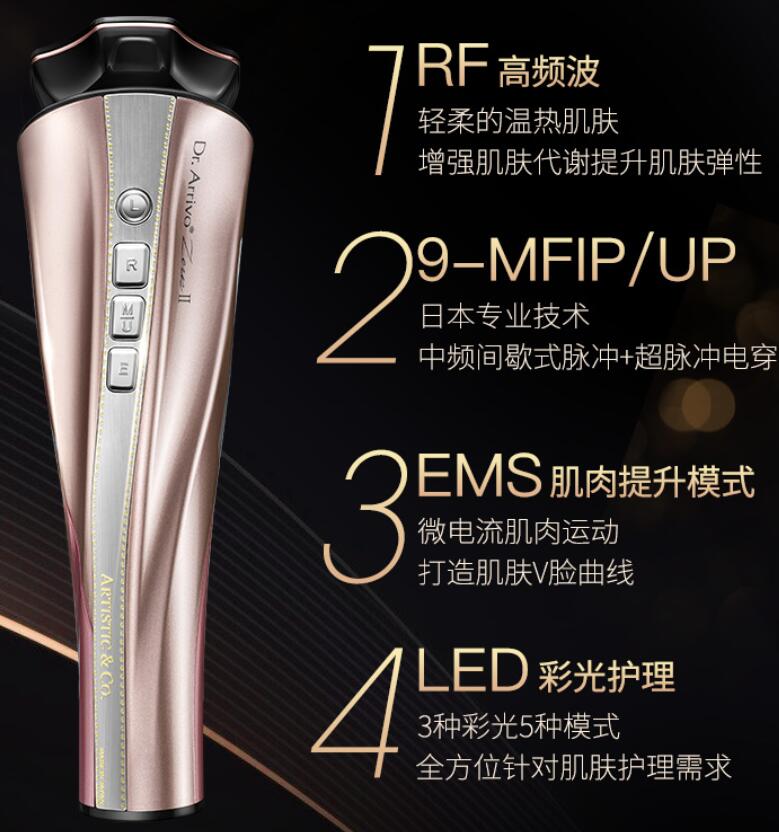 鎏金机体,如繁花盛放般的外形,耀金玫瑰粉双色可选,颜值升级,流畅的曲线,符合人体工学设计,握感更舒适,视觉、触觉新体验。它具备提拉、紧致、抗老、美白、祛痘等多重功效,能一步到位帮你解决皮肤问题!五代有带钻和不带钻两版,二代没有花更多成本在浮夸的镶钻上面,而把成本用在了增加功效的地方,比如二代拥有9个24K镀金触点。日本秘传镀金工艺24K黄金导头,内外兼修,奢华质感外更亲和肌肤,3D自由导头可全方位自由转动,零缝隙贴合面部曲线,消肿紧致,全面提升面部轮廓,效率再升级。