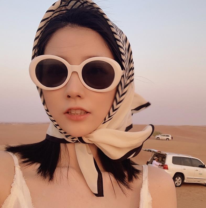 第三步:然后将它的结放在脖子前方系上,最后再整理一下就好了。小方丝巾的系法二