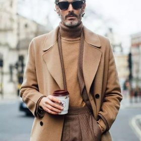 高领毛衣搭配西装和大衣时造型优雅绅士,高领毛衣能化解西装造型的严肃性,外加一件毛呢大衣造型简洁大气,在室内脱掉大衣造型依旧很有绅士范。