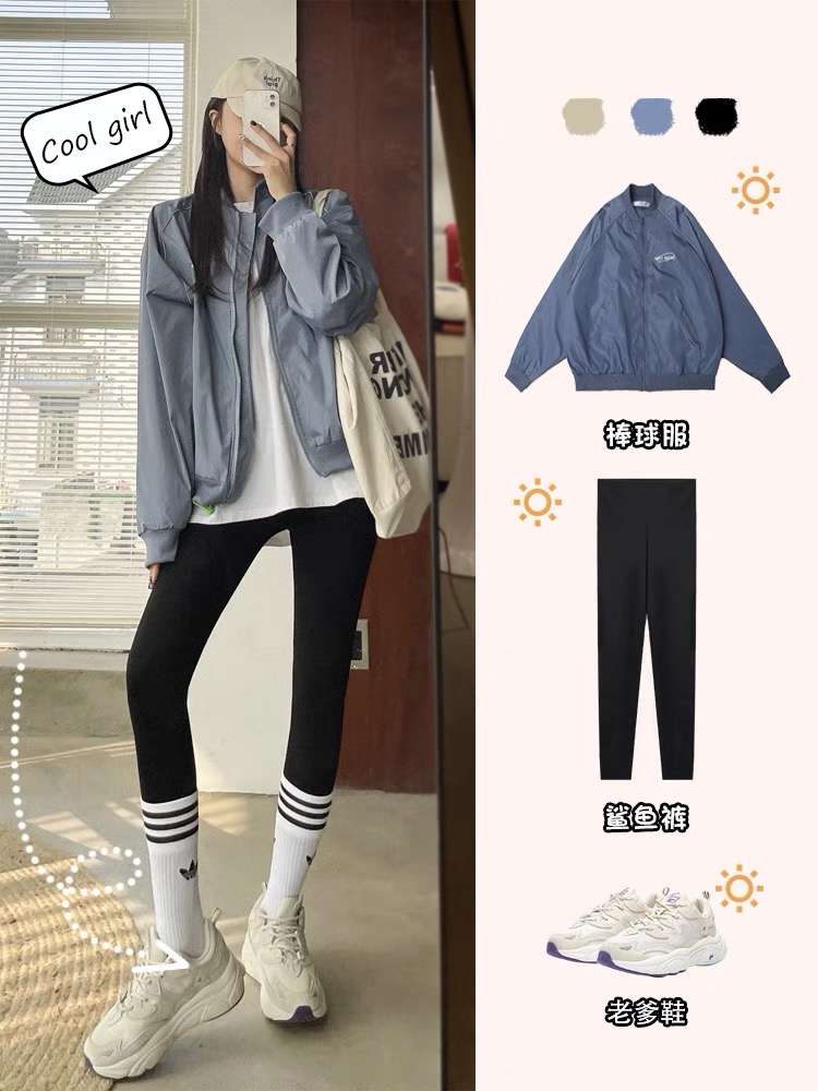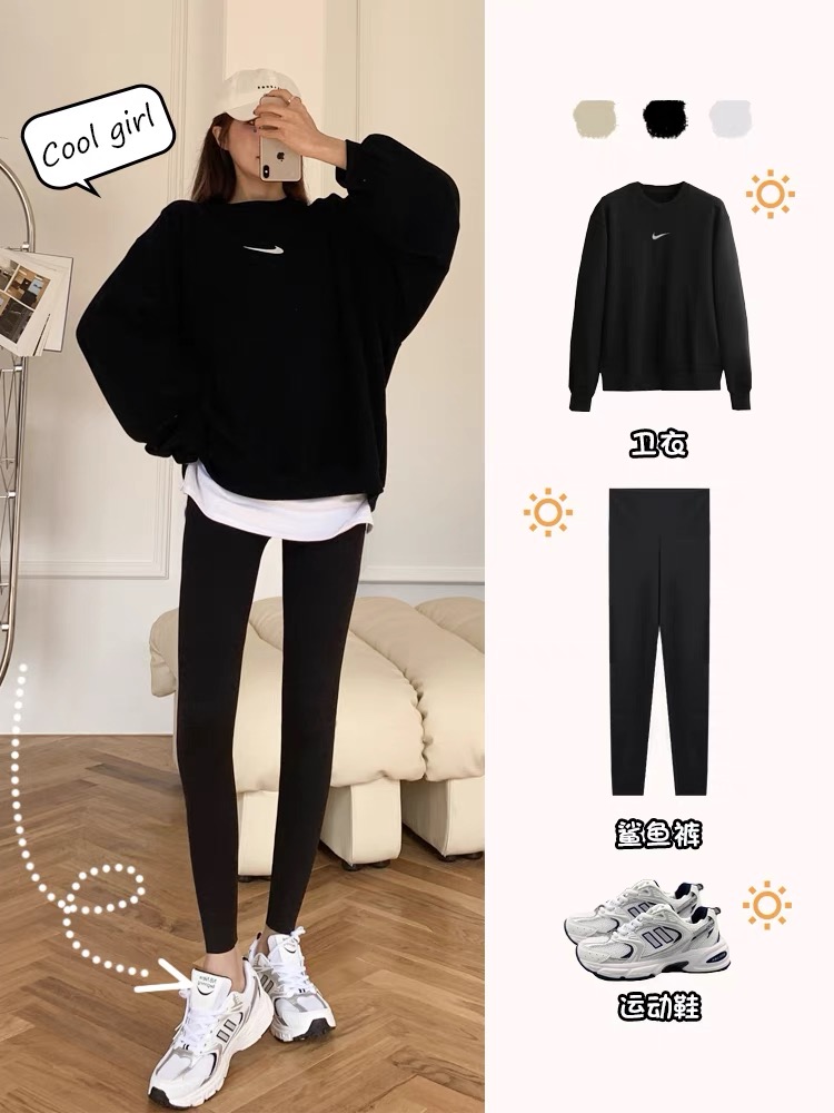 鲨鱼裤可以搭配卫衣跟运动鞋穿,最好是遮住pp长度的卫衣。很多女生对自己的pp都不是特别自信,这样的穿法可以完美的掩盖pp的缺点哦,再也不用不自信啦。