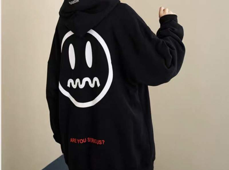 3、红色卫衣搭配黑色的印花夹克,撞色效果非常好,如果想要清爽的感觉,我们在选择红色卫衣的时候,卫衣长度要短于夹克的长度。