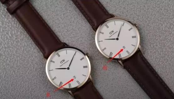正品DanielWellington(DW)手表的正面有较多的辨别点,下图示例对比左真右假,针对不同款式系列可以通用的细节有以下几点: