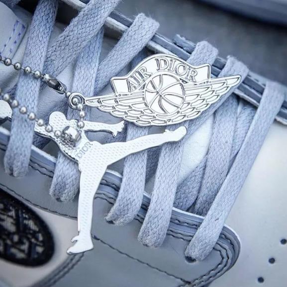 中底拉帮和普通AJ也完全不同,正品的中底皮革浮雕的设计,整体的质感非常的好,在闪光灯的照射下,不会像假货有明显的反光;Dior提花45度的倾斜,在一个小小的勾子上也能把其老花的美感淋漓尽致的体现出来。飞翼上JORDAN被DIOR替代,足以体现出Dior创意总监KIM JONES对AJ1的热爱。