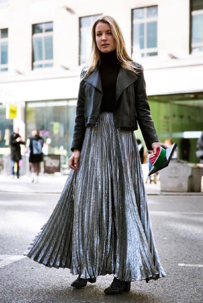 搭配西服更加利落干练。如果想更正式OL一些,就内搭衬衣,搭配细跟剪头皮鞋。百褶裙的材质可选择比较有质感的。如果想轻松随意些,就选择休闲款西服,内搭吊带、T恤等。裙子选择轻薄飘逸材质的。