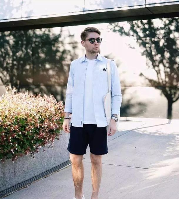 上衣同样是蓝色的短袖衬衫,对于一些时尚的男生来说,其实蓝色的衬衫相于来说更加可以体现出男士们的魅力,而且夏季穿蓝色的衬衫还会显得比较有活力的气息,尤其是它下身的搭配上还是灰色的短裤,典型的正式跟休闲的搭配组合,不会让你整件短袖衬衫看起来显得比较无趣古板。