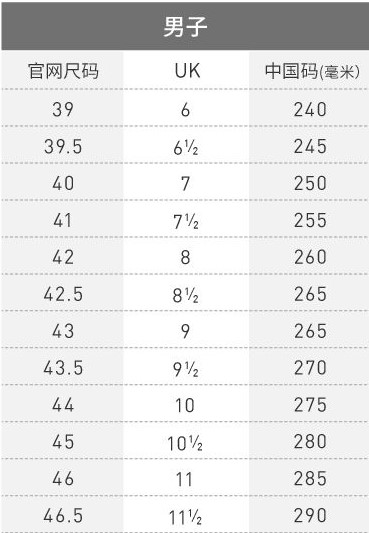 一、Adidas阿迪达斯男鞋尺码对照表: