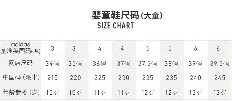 三、Adidas阿迪达斯童鞋尺码对照表: