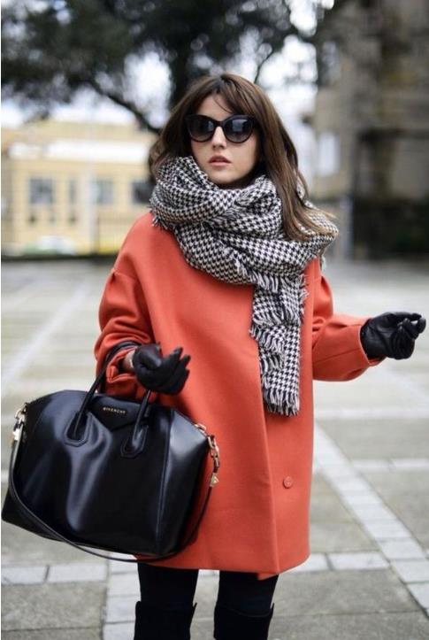 样式普通的围巾造型,在整体搭配效果上会给您耳目一新的感觉。这种围巾会使脖颈处稍显蓬松,所以在搭配大衣时,要将衣领立起,把围巾系在外面,这样看起来不会显得臃肿。