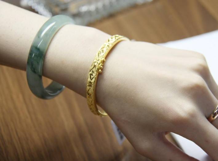 一个翡翠手镯,一个黄金手镯,可以把翡翠玉镯戴在左手上,把黄金手镯戴在右手上。翡翠手镯质地坚硬,但是十分易碎,因此戴在左手(左撇子例外)上,这样女性朋友在工作以及做饭时不容易损坏。黄金质地较软,如果和翡翠手镯佩戴同一只手腕上很容易因为摩擦碰撞导致黄金手镯变形,因此把其佩戴在右手手腕上是一个不错的选择。