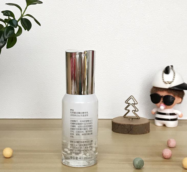 瓶身粉粉的,很激发少女心,玻璃瓶比较有质感。压嘴每次挤出的精华乳量适中,盖子盖严会咔一身,很有日韩的精致感。挤出乳液,闻了一下,淡淡的花香。涂抹开未完全吸收时,滋润度较高,涂抹的比较厚十五分钟后完全吸收,皮肤触感柔滑,干燥肌纹有所改善。并且皮肤看上去有光泽。