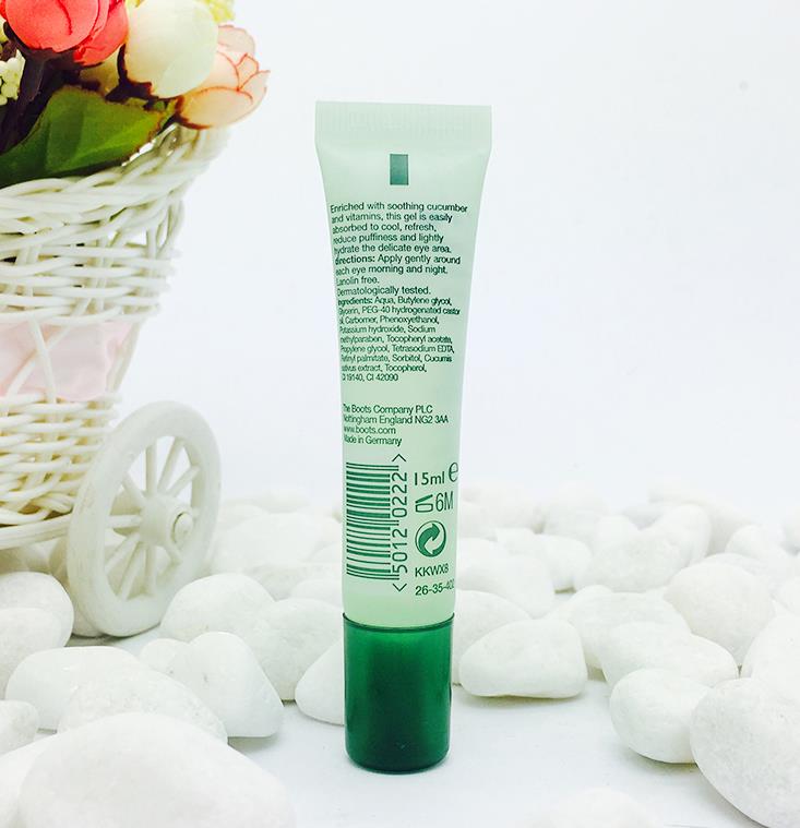 最近比较喜欢博姿(Boots)这个牌子 纯天然无刺激 包装很清新 看着就觉得很舒服 全部是英文说明 大概可以看明白,这款眼胶一打开就可以闻到清新的黄瓜味,眼胶很清爽,比芦荟胶稍浓稠,有股淡淡的黄瓜清香。直接把眼胶点在眼睛上,涂抹时凉凉的,很舒服。我是油皮,用了一冬天也不长脂肪粒~夏天用应该更舒服~ 眼胶含有黄瓜精华和维他命,可以被轻松地被吸收,减轻浮肿,舒缓并为眼部肌肤保湿。适合年轻女孩儿用的入门眼胶。