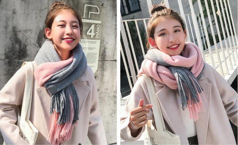 适合的围巾款式: 这种系法同样是适用于长款围巾。如果想要造型上看着更灵动一些,可以选择带流苏的款,让上下两层围巾耷拉在一起时更显层叠美。