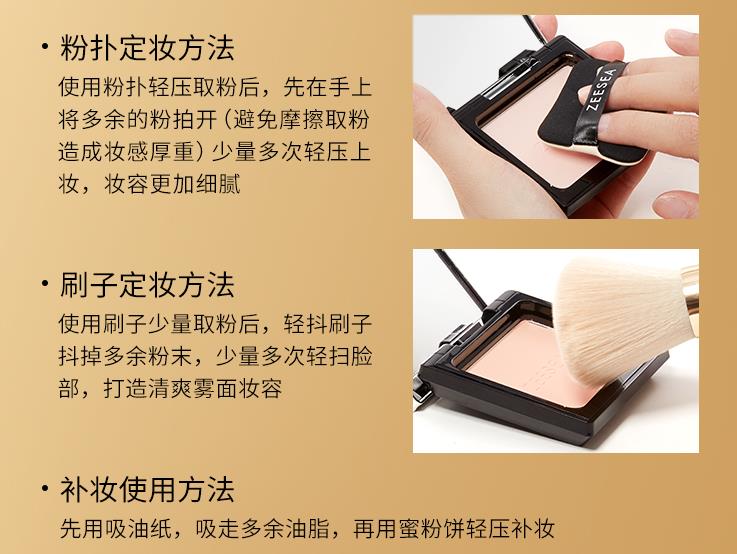 粉饼一般在粉底液或者BB霜之后彩妆(眉毛、眼妆、唇妆)之前使用。粉饼,由多种粉体原料(包括颜料)及黏合剂(油脂成分)经混合、压制而成的饼状固体美容制品,具有遮盖、附着、涂展、赋色、修饰的功能,视使用的方式的不同分为干用、湿用及干湿两用型。此类产品多具清凉感而大多用于夏季。
