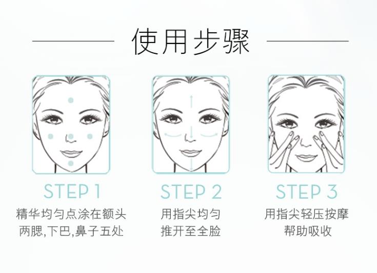 3. 使用爽肤水后,使用精华液(olay小白瓶),能够很快地渗透到皮肤的里层,达到护肤的效果。将olay小白瓶精华液均匀地点涂在额头两腮,下巴,鼻子等部位,再用指尖均匀推开至全脸,或是取适量精华滴于掌心,搓揉均匀后迅速涂抹全脸。