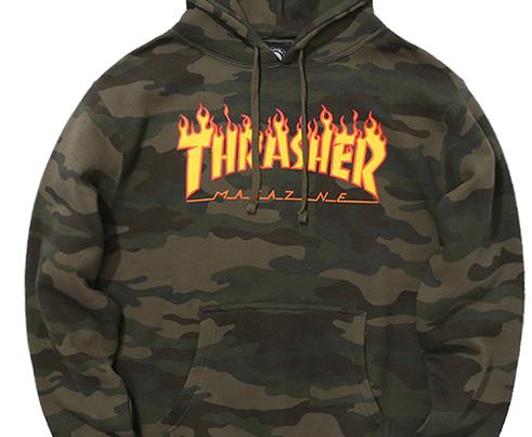 thrasher是美国较为火爆的潮牌,是滑板杂志旗下的品牌。thrasher旗下的服饰中火焰的图案辨识度强且设计独特,深受广大明星和时尚人士的喜爱。thrasher还与 Supreme等品牌联名,知名度更上一层。