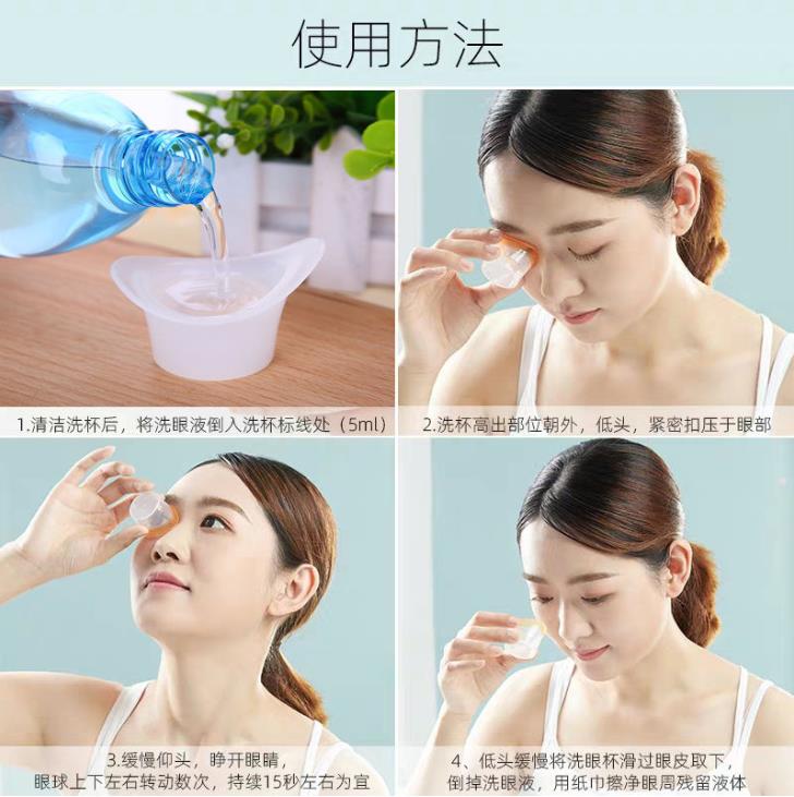 还有一种是洗眼的眼部护理液,这类眼部护理液的使用一般是先打开瓶盖,然后倒出适量的洗眼液到洗眼杯中,将洗眼杯高出的部位和外眼角对齐,再低头,然后把洗眼杯向上扣在眼角,头仰起,使眼睛得到护理液的浸润,适量摇头,最后慢低头取下洗眼杯,闭眼用净水清洗眼睛即可,记得清洗眼睛后要清洗洗眼杯。