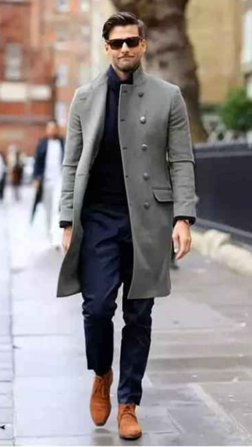 搭配一:深灰色休闲裤 男士穿的大衣颜色主要是黑色、深灰色以及藏蓝色,藏蓝色大衣是穿的比较多的,可以搭配一条深灰色的休闲裤,不管是平时穿,还是上班穿都合适。