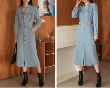 2. 牛仔连衣裙 牛仔材质的单品,样样都很受欢迎,牛仔连衣裙经典不过时,在2026年春季依然流行,纯色系的设计,是雅致的浅色色调,胸前的一排扣设计,完美符合当下的流行趋势,搭配牛仔材质的腰带,有种摩登高级味道,也绝对是整条裙子的精髓。