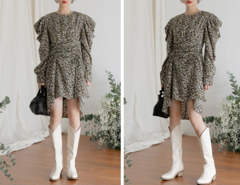 3. 碎花裙 春季流行哪些款式的连衣裙?不得不推荐这款碎花裙,超级吸睛养眼的款式,上身显得大气感,袖子立起的褶皱设计,显得特别有气场,腰间的抽绳造型,令设计细节感更加明显,小碎花的图案,看起来尽显青春复古感,身材也会显得更高挑!