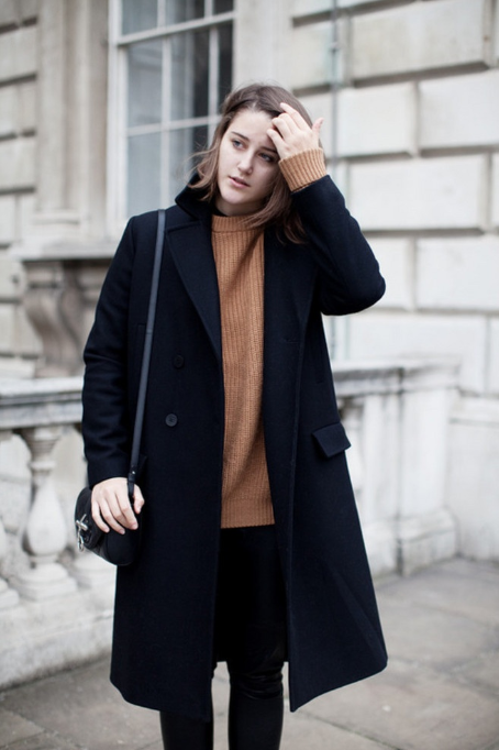 1. 搭配同色系的打底衣。选择同样是黑色的打底衣来搭配这样的外套是永远不会过时的穿搭方法,而且这样子穿还非常的显瘦。