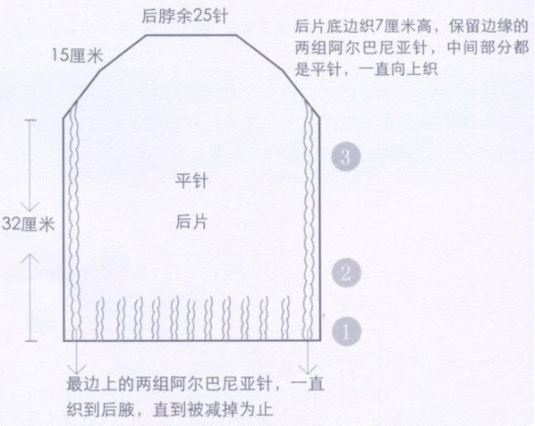 ①起79针,6号针,阿尔巴尼亚针,织7厘米高。(后片底边织7厘米高,保留边缘的两组阿尔巴尼亚针,中间部分都是平针,一直向上织;最边上的两组阿尔巴尼亚针,一直织到后腋,直到被减掉为止) 小外衣棒针毛衣编织款式图解 后片排花 3 1 1 1 2 1 1 1 2............... 正 反 正 反 正 反 正 反 正............... 针 针 针 针 针 针 针 针 针............... 2 1 1 1 2 1 1 1 2 1 1 1 3 正 反 正 反 正 反 正 反 正 反 正 反 正 针 针 针 针 针 针 针 针 针 针 针 针 针