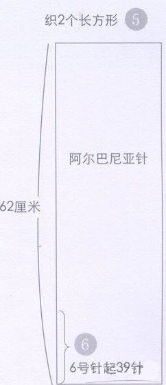 ④袖子:织圈。6号针起40针阿尔巴尼亚针,织7厘米高后织平针,在中间选2针作为加针点,在这2针左右各加1针,之后隔11行第]2行再加1次,织到48厘米长后,共加了8次,多加出16针,整个袖子最肥处为56针,之后在加针点的左右各平收4针,这样开始织“袖山”。