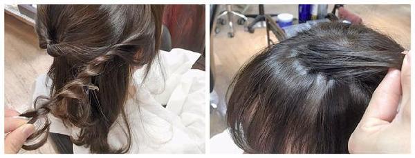 STEP1:用32mm的卷发棒为发梢施加卷度。STEP2:取出头顶的发丝,如图所示。