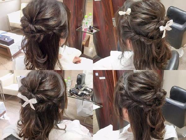 抽松发辫,让效果更自然,并使用蝴蝶结发饰点缀。