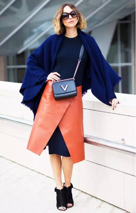 2.藏蓝搭配焦糖色:这两种颜色都有深邃的高级质感,搭配在一起有复古的风情。藏蓝色毛衣搭配焦糖色半身裙就是最好的诠释。另外,藏蓝色毛衣加上焦糖色的高腰阔腿裤也很好看,满满的复古风情,又能显出大长腿。