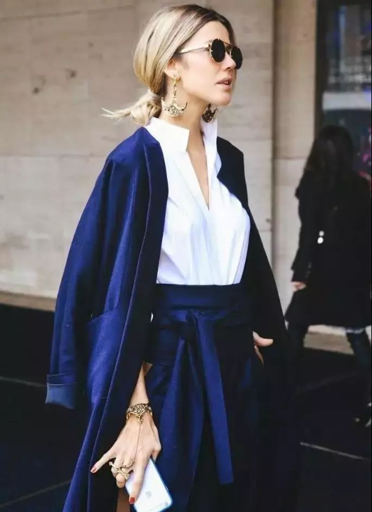 4.藏蓝搭配白色:虽然白色在搭配中很多时候都是作为过渡色而存在,但将藏蓝色和白色这两种颜色搭配,也完全没问题。白色能和藏蓝色一起体现高级质感,也能衬得藏蓝色更加轻盈。
