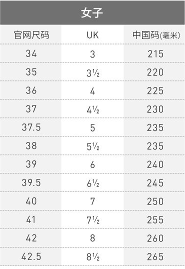 Adidas阿迪达斯女鞋尺码对照表