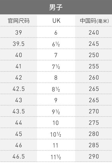 2.Adidas阿迪达斯男鞋中码标准采用毫米数,即测量脚长的长度。如:265mm的脚长,对应的英码是9、官方网尺码是43。