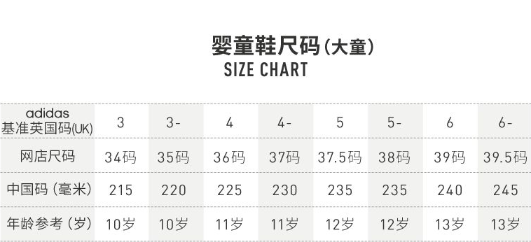 2. Adidas阿迪达斯大童中码标准采用毫米数,即测量脚长的长度。如:225mm的脚长,对应的英码是4、官方网尺码是36。