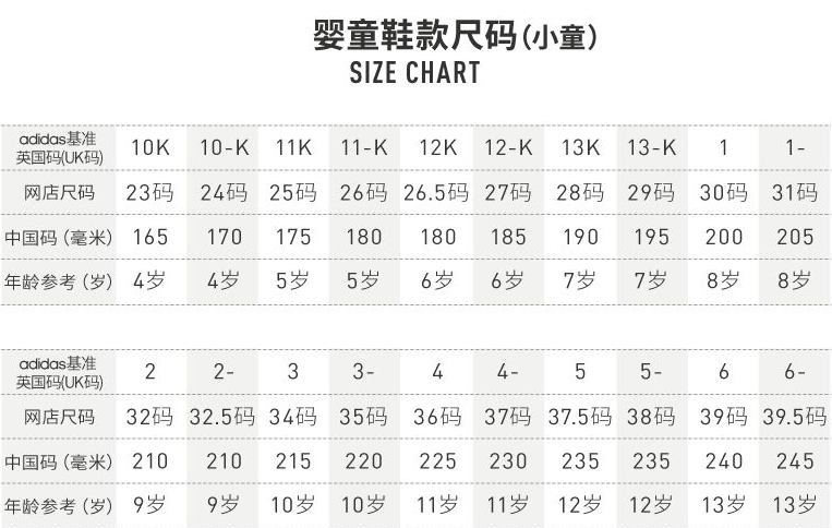1. Adidas阿迪达斯大童尺码说明:常见有以下标法:英码、中码、官网尺码。