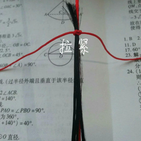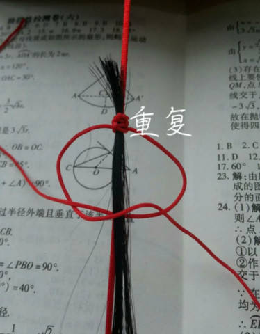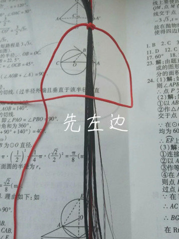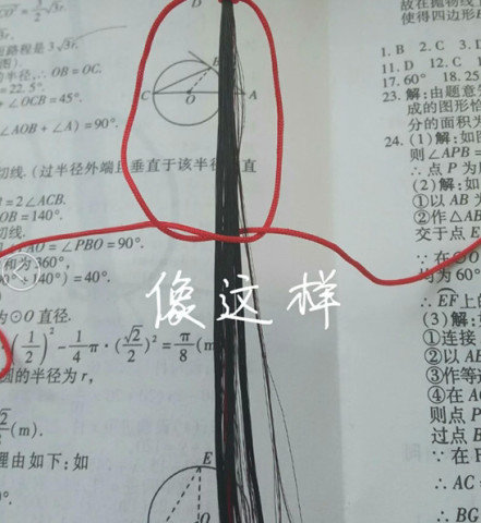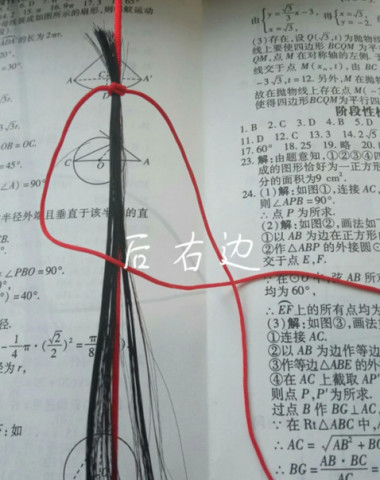 首先我们就需要一根长绳子,最好是红色的,然后剪下来一段头发,将绳子折中然后先绑成一个结在头发的最上方,接着就将位于右边的绳子,从头发上方穿过,然后压在左边绳子上面,接着从右边绳子的半圆处拉出来,然后拉紧。