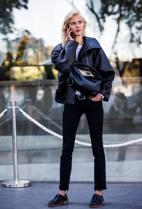 万年百搭的黑色,不管跟什么颜色搭配在一起都能释放出不同的色彩效果,喜欢黑色浓烈气息的,那就来的更加猛烈一些的,在下装裤子的颜色上可以同样选用黑色的裤子搭配,也会很好看,但是鞋子颜色上建议尽量选用白色为主,这样能自然的为整体的黑色穿搭造型带来一定的增亮色调。