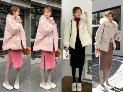 粉色的开叉半身裙搭配粉嫩的外套,脚下再穿一双白色的保暖鞋,甜美与气质双满分;黑色的半身裙搭配红色的毛衣,外面再披一件白色的外套,看起来就是一位小仙女啦!