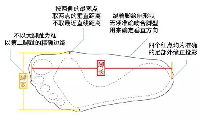 如用笔在脚的最顶端和最底部以及脚最宽的地方画上直线,然后再用卷尺进行测量。