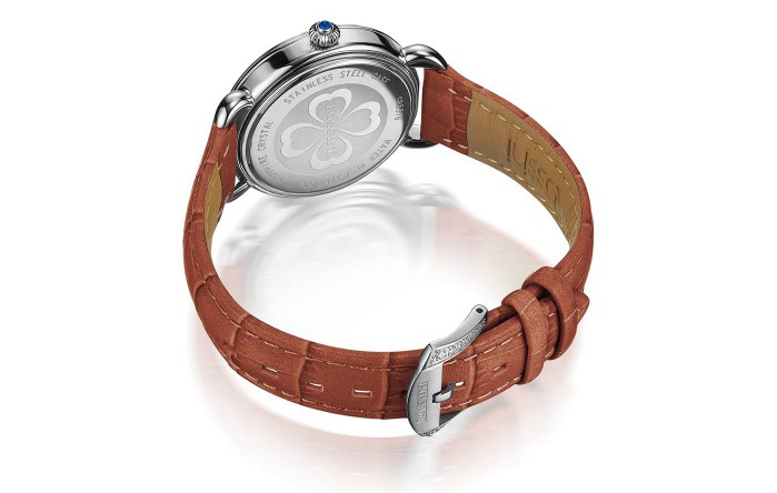 罗西尼奥俪薇系列SR5576W06C腕表为不锈钢材质,在表圈部分镶嵌钻石,呈现璀璨耀眼,除了表圈镶嵌钻石之外,时标刻度也镶嵌了一部分钻石,6、12点位置使用漆绘艺术字体,整体设计柔和婉约。