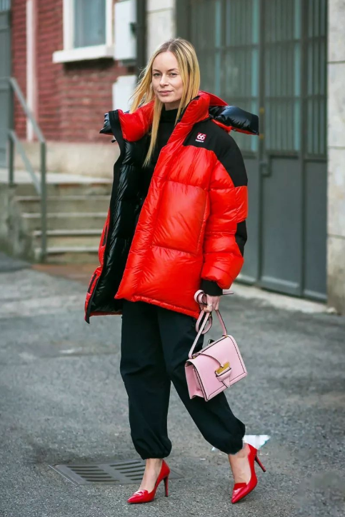 羽绒服是冬季必备的单品,厚重的羽绒服搭配粉色包包在视觉上完美的减少了羽绒服带来的厚重感,更多的添加了些许轻快、俏皮感。