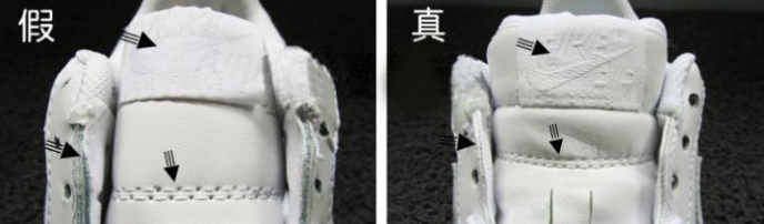 假版:采用二层劣质PU皮,缝接处做工粗糙、车线简单易脱线、鞋舌不厚实硬影响穿着舒适度,lOGO不清晰。