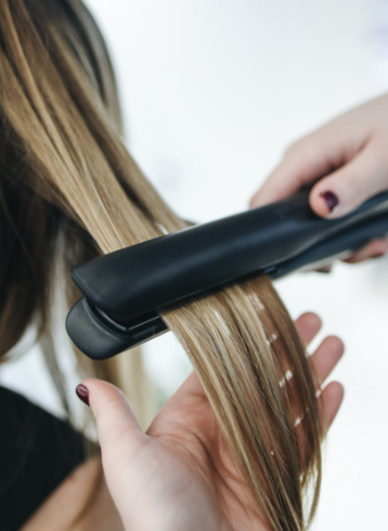 2、用直板夹,从头发的中段开始,用直板夹夹住下拉,到了发尾的时候把直板夹朝内卷出一个弧度。