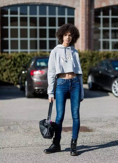 1.高腰牛仔裤+短款卫衣。这样的搭配从视觉上能拉长腿部比例,具有显高、显瘦的效果,非常适合个子矮小的人穿。