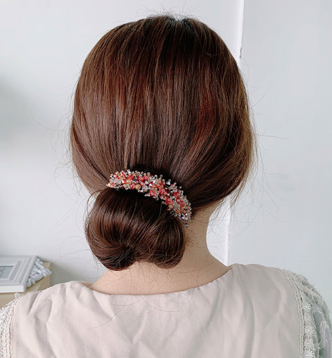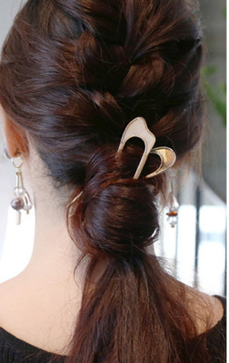抓起发梢 往内卷起,用的是平头的鸭嘴夹牢固点,翻下去直接夹起来,左右各一个就可以固定了,再用个小小的发饰遮住皮筋就完成了!