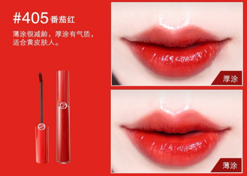 非常的适合,而且在这阿玛尼405适合黄皮,一只红管唇釉,我想你该很多人都非常的熟悉了,几乎是现在非常热门的一个色号,而且一个南方先生能够使其他吸引人的目光非常难写白,而且它的整个颜色非常的顺畅,完全不挑皮肤,无论是薄涂还是厚涂都非常的好看,对于黄皮女生来说也是非常的友好了!
