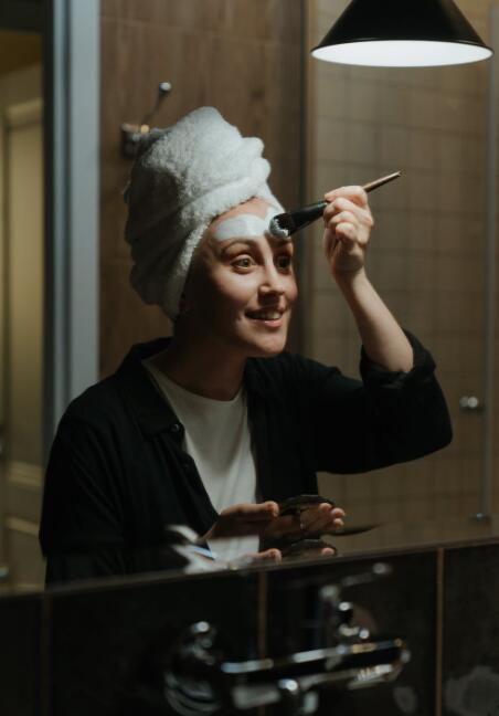 2.按压的正确步骤是从最平坦的面部区域,顺着肌肤纹理涂抹,从脸颊—额头—眼部—鼻子—下巴。