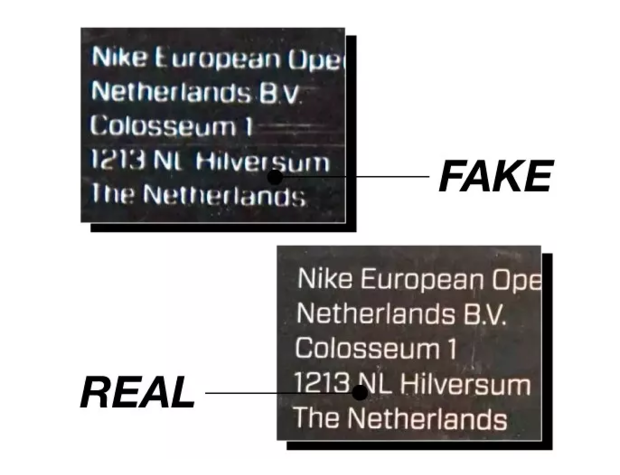 上假:假鞋鞋盒上字体模糊不清,字迹也不完整。