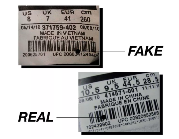 下真:真标条形码只有两种粗细线条;尺码栏部分的US、UK、EUR、cm的字母间距大致相等;UPC码一行的字母、数字间距各自相等;字体看起来清晰