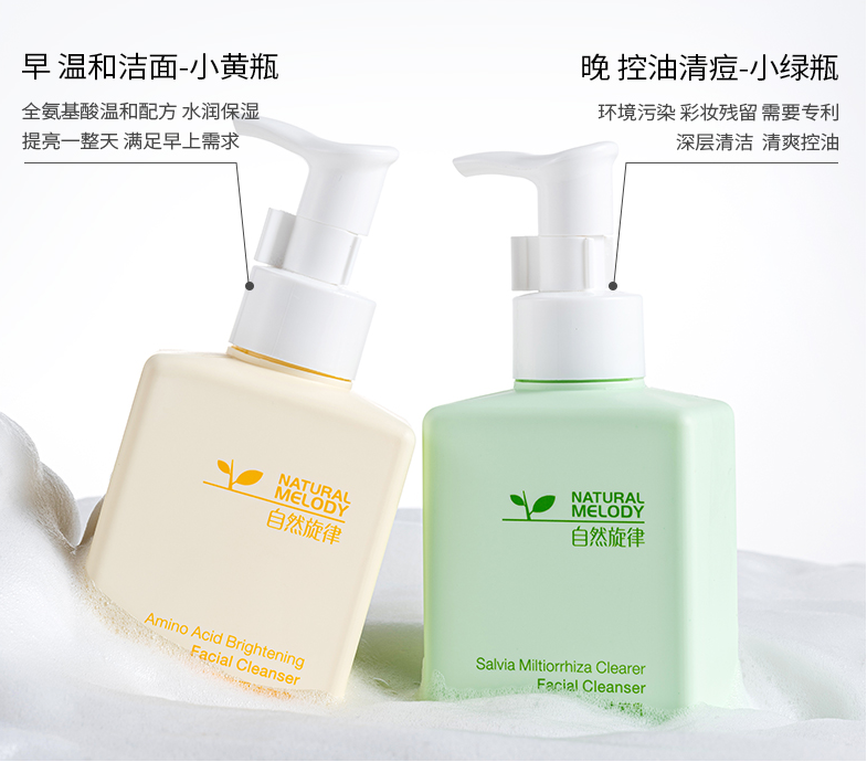 自然旋律洗面奶,日本进口氨基酸,温和清洁,净扯毛孔,清爽控油。这款氨基酸洗面奶,分早晚两用,晚间小绿瓶,主要功效,清爽控油、清理痘痘;早上小黄评,温和清洁不紧绷。